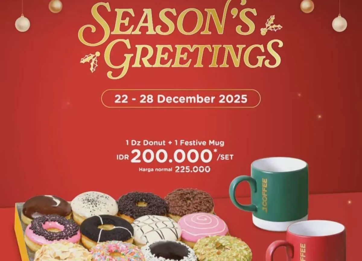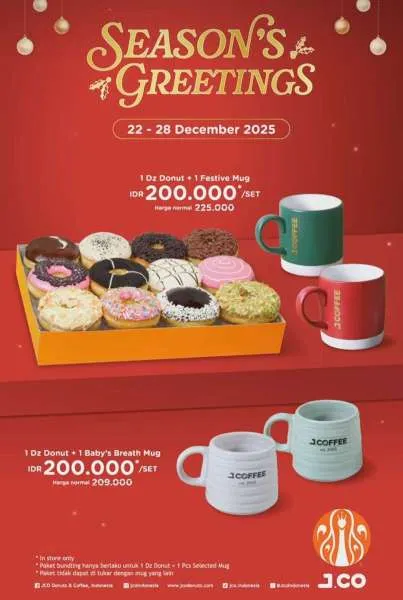 MOMSMONEY.ID - Promo J.CO Season’s Greetings yang berlangsung dari 22-28 Desember 2025 memberikan harga spesial untuk paket donuts dan festive mug.
