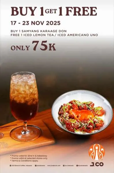 Selain itu, di J.CO juga ada promo Buy 1 Get 1 Free berupa Samyang Karaage Don mulai 17-23 November 2025 saja. Anda bisa mendapatkannya di store J.CO tertentu saja.