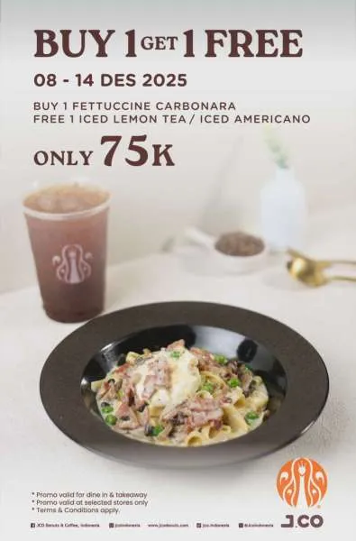 Selain itu, J.CO juga ada promo Buy 1 Get 1 Free sampai 14 Desember 2025. Anda bisa menikmati lezatnya Fettuccine Carbonara yang sudah lengkap dengan minuman segar.