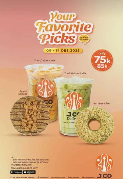 Dikutip dari Instagram @jcoindonesia, promo Your Favorit Picks menyediakan bundle minuman dan donut hanya Rp 75.000 saja sudah dapat Iced Italian Latte + Iced Matcha Latte + Spiced Cookies + Mr. Green Tea, dari harga normalnya Rp 85.000.