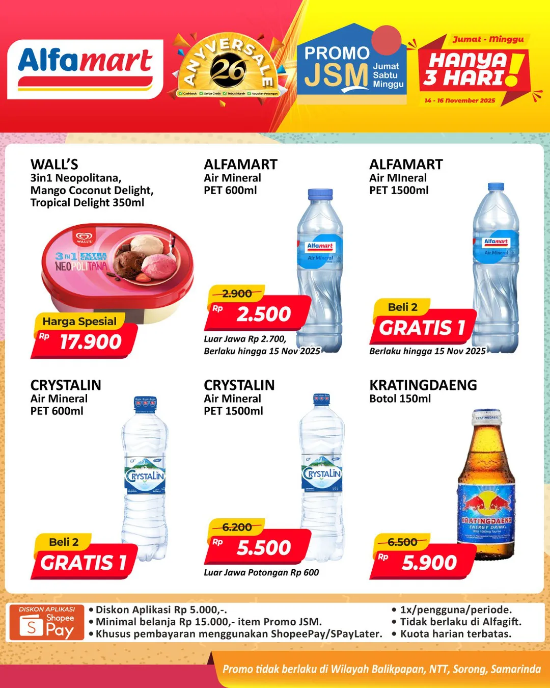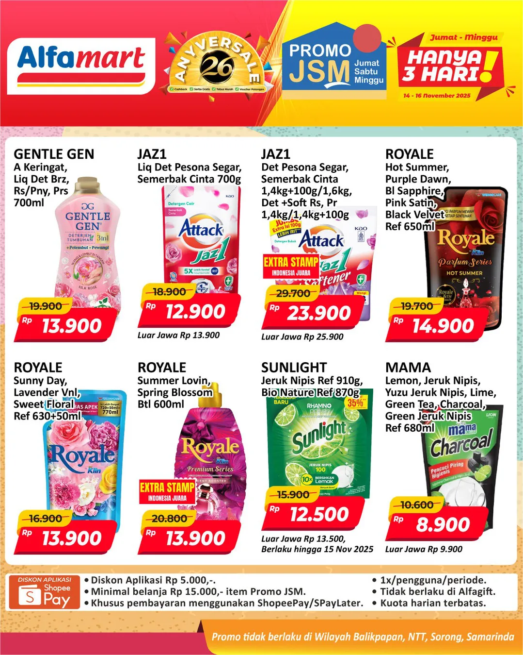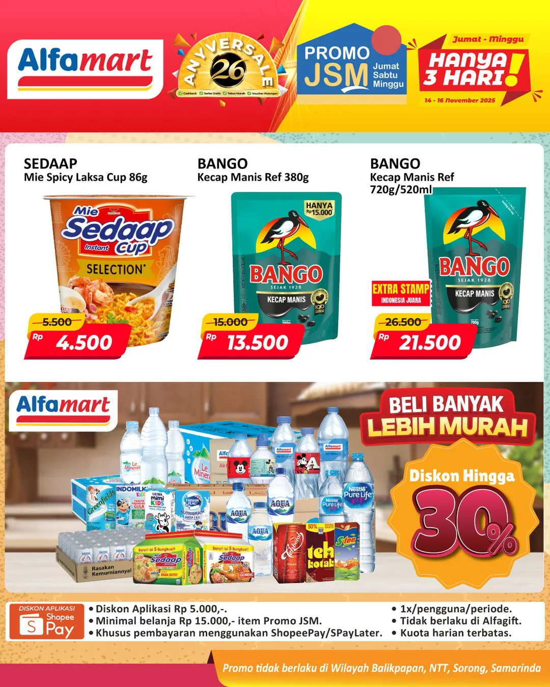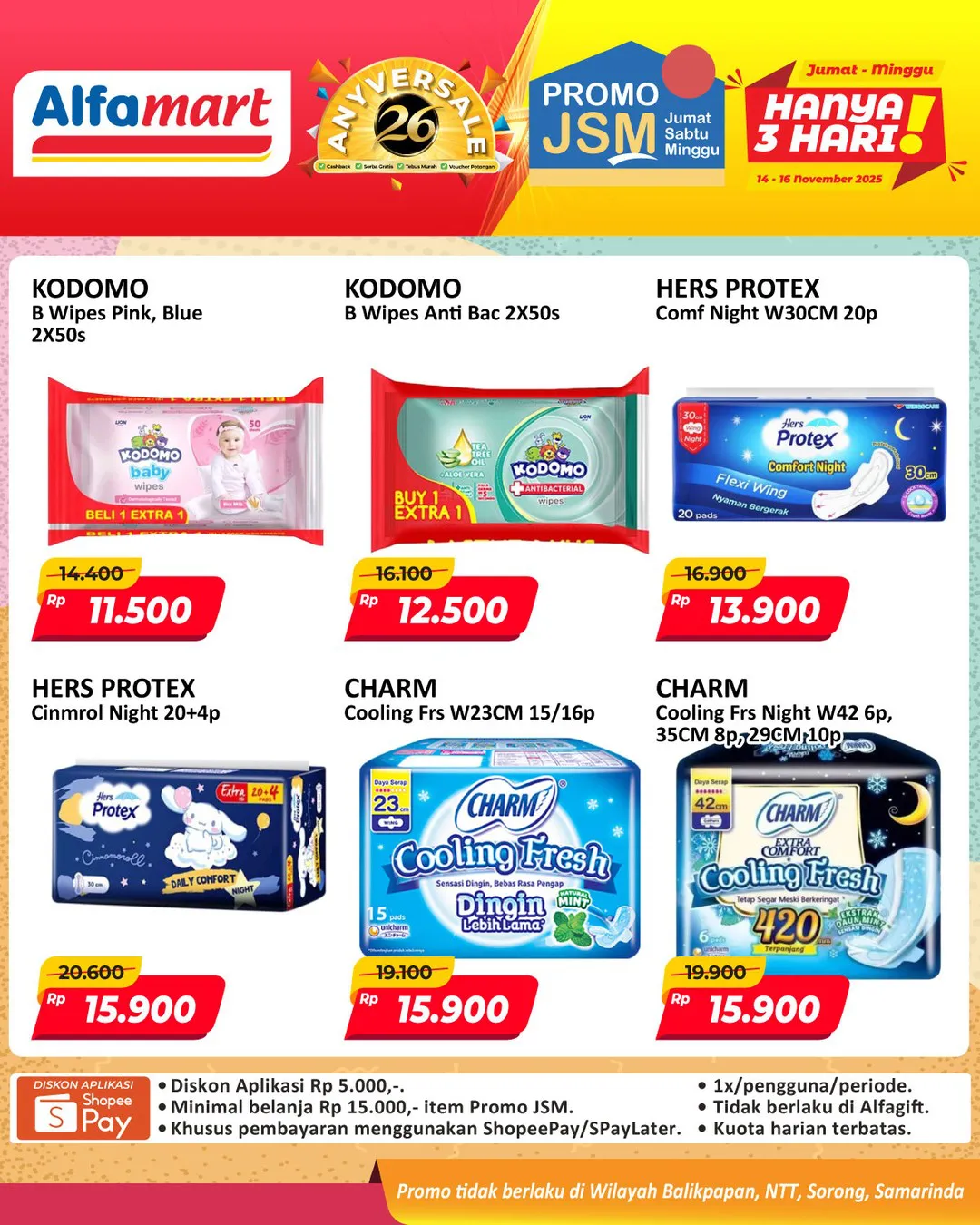 Harga promo JSM Alfamart periode 14-16 November 2025 tidak berlaku di wilayah NTT, Balikpapan, Samarinda dan Sorong ya, Moms.
