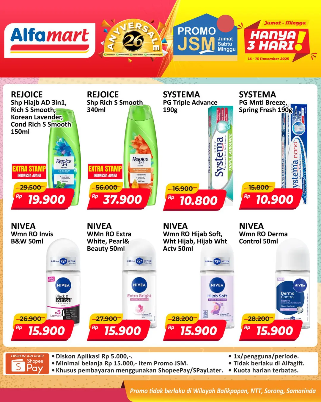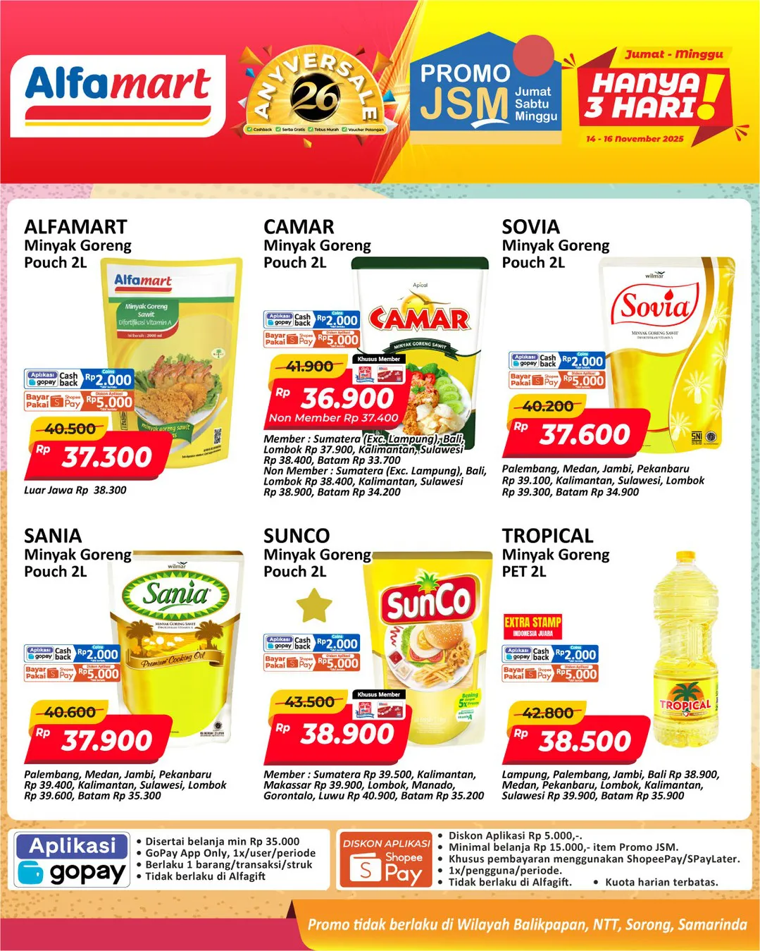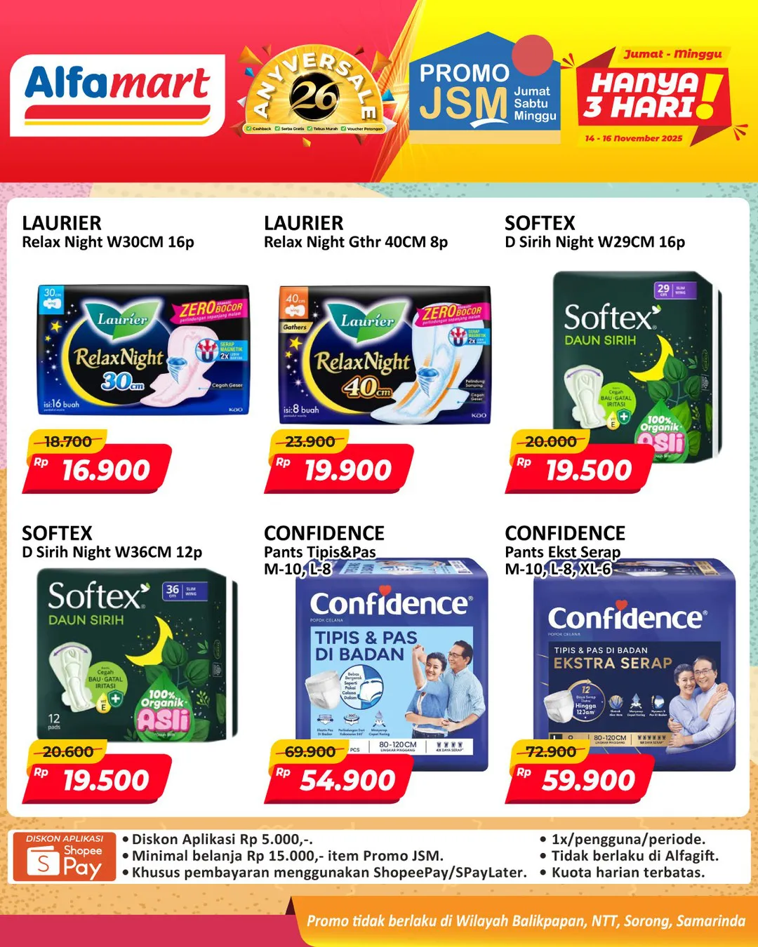 Harga promo JSM Alfamart periode 14-16 November 2025 tidak berlaku di wilayah NTT, Balikpapan, Samarinda dan Sorong ya, Moms.