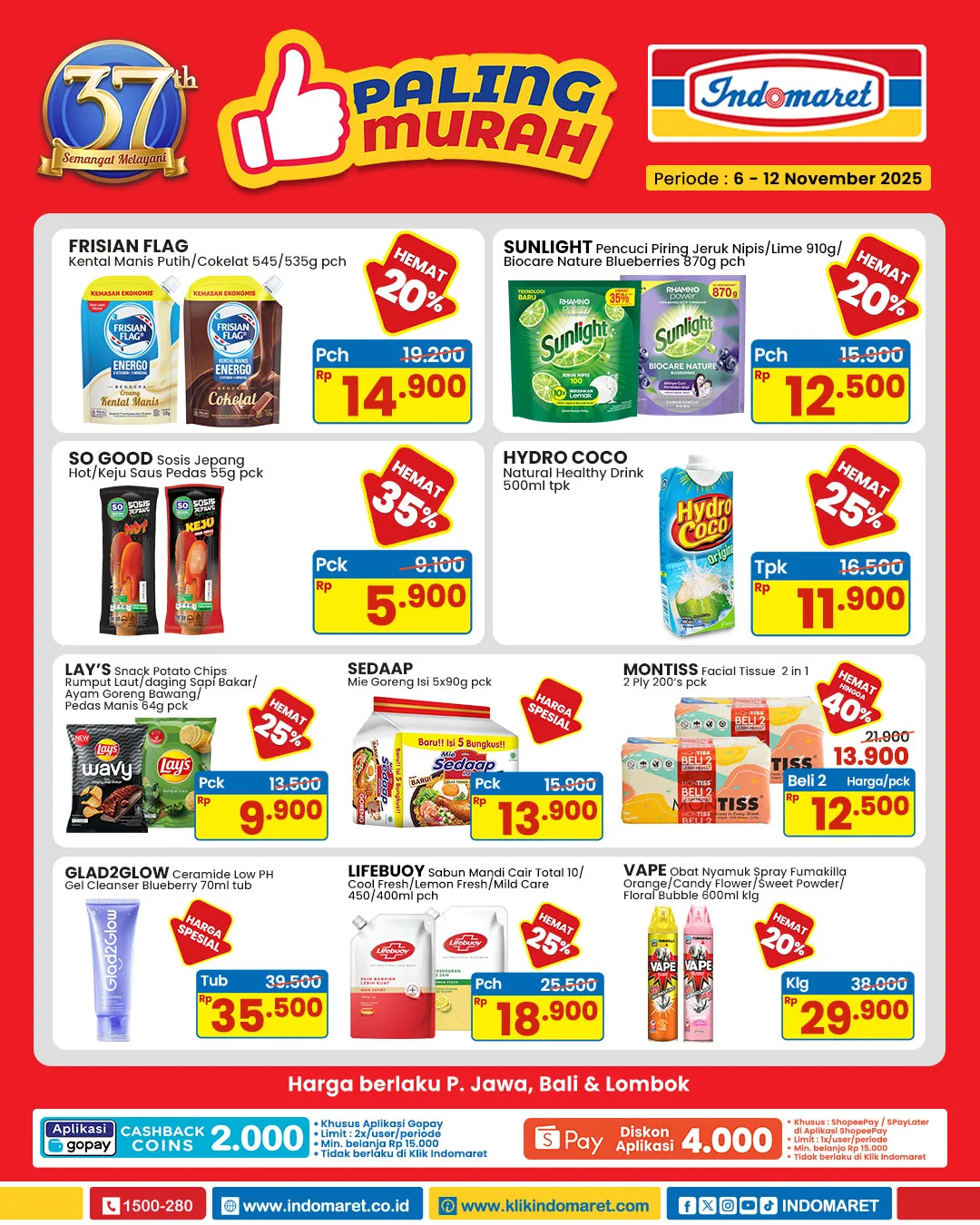 - Khusus pembayaran penuh di toko Indomaret, minimal belanja Rp 15.000, limit maks. 2 (dua) kali/user/periode, tidak berlaku di Klik Indomaret