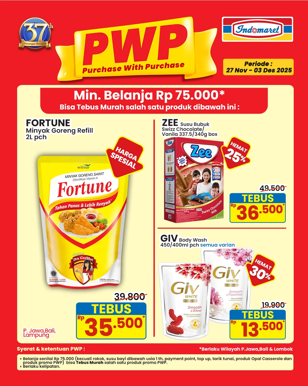 Selain Diskon dan Harga Spesial, ada juga Tebus Murah untuk Fortune Minyak Goreng 2 Liter, Zee Susu Bubuk, dan GIV Body Wash. Tebus Murah berlaku untuk Belanja minimal Rp 75.000.