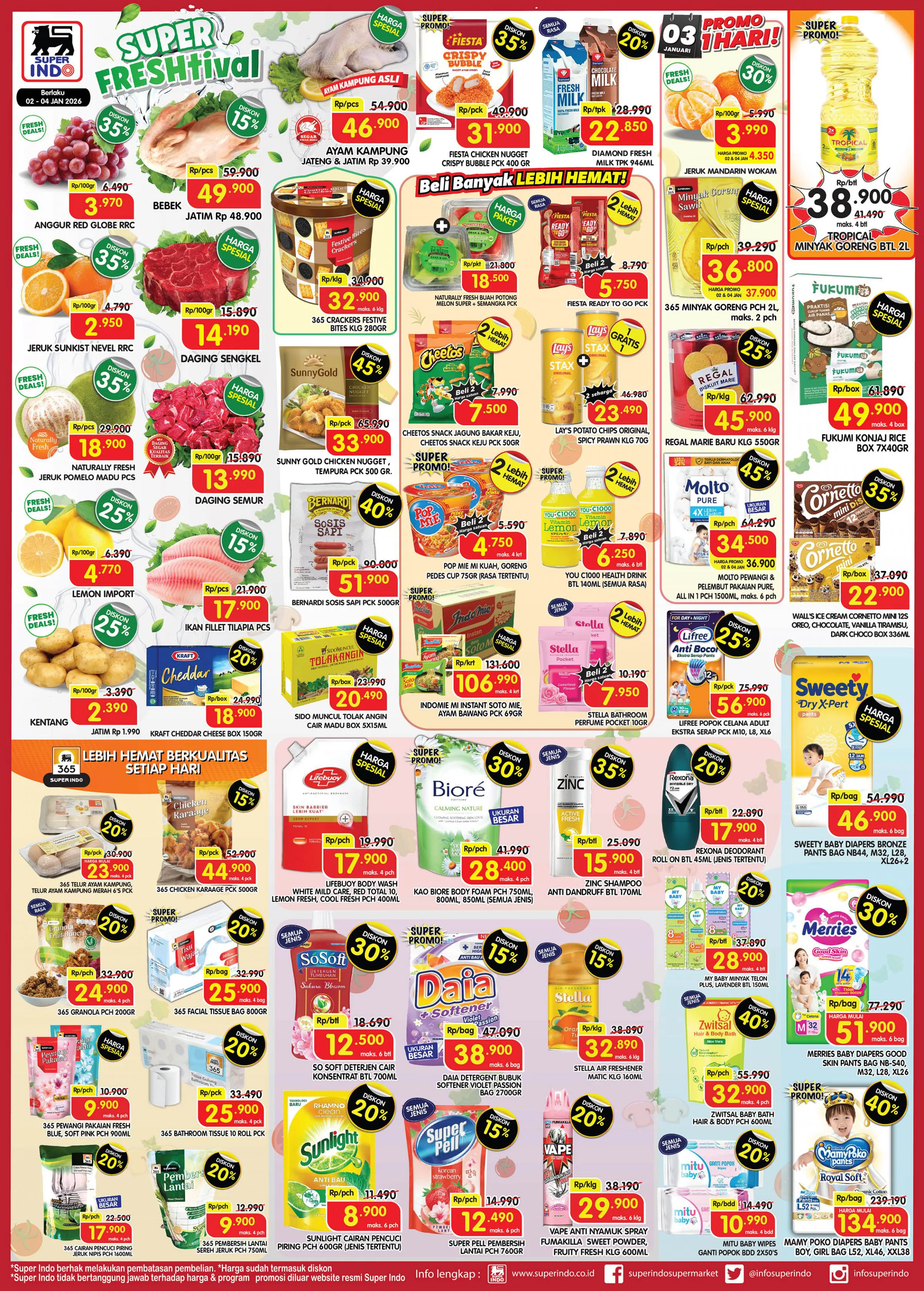 Pada akhir pekan ini, 2-4 Januari 2026, di Superindo terdekat juga ada promo JSM Superindo yang menawarkan Diskon sampai 45% untuk berbagai produk. Berikut beberapa di antaranya: