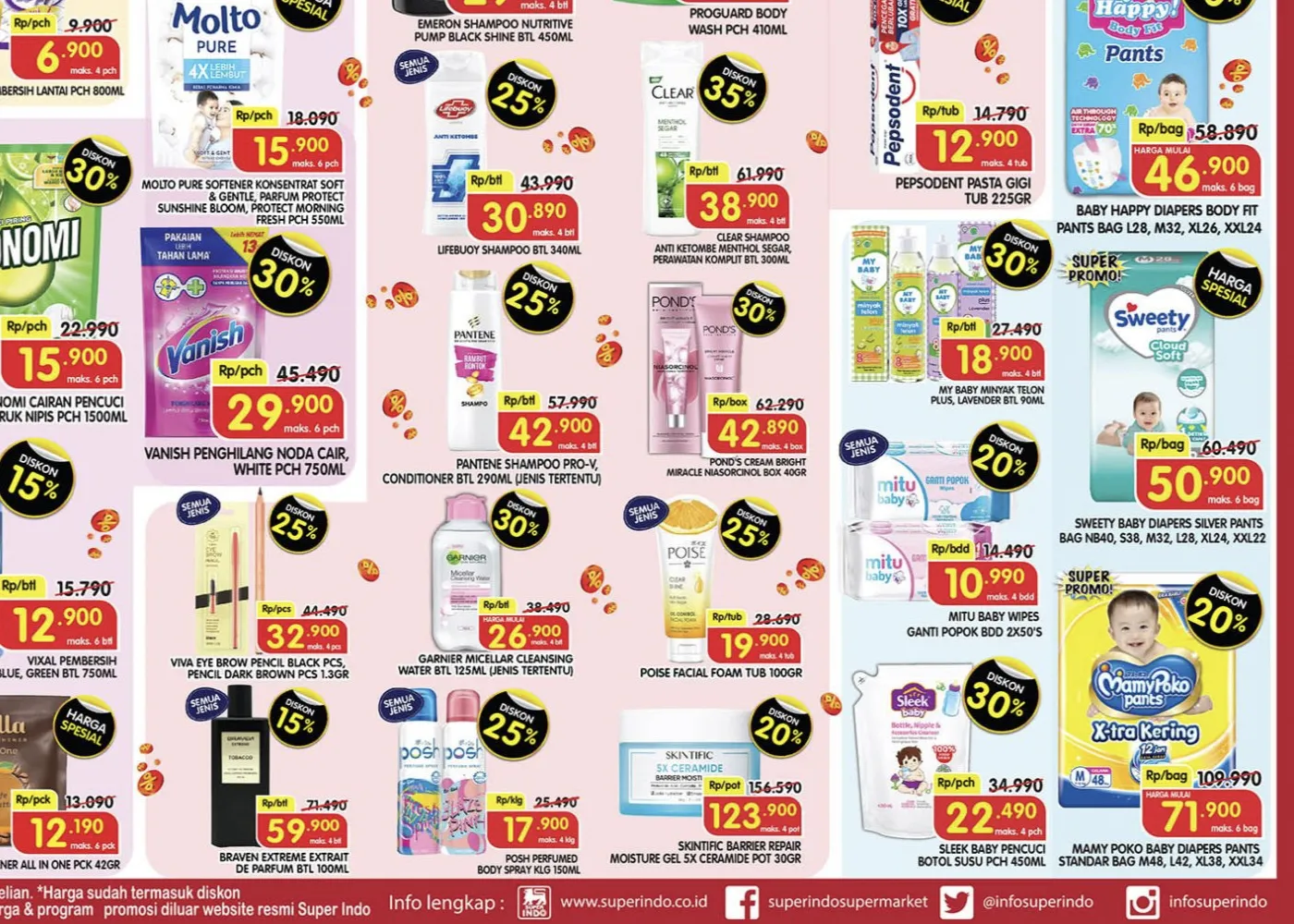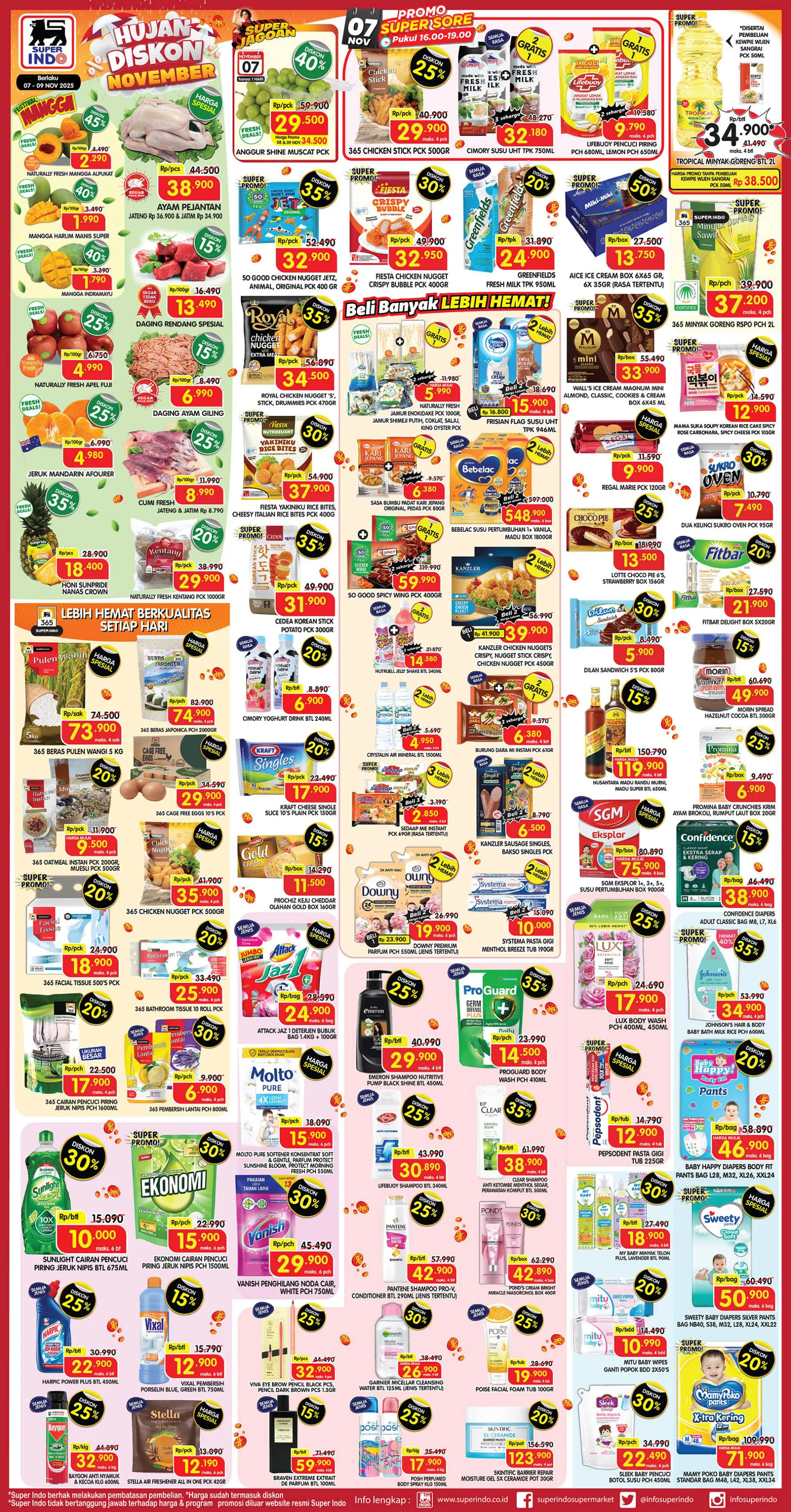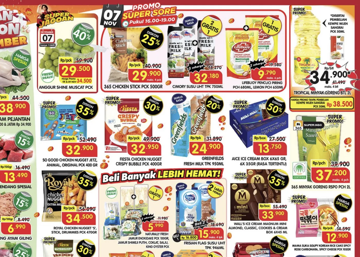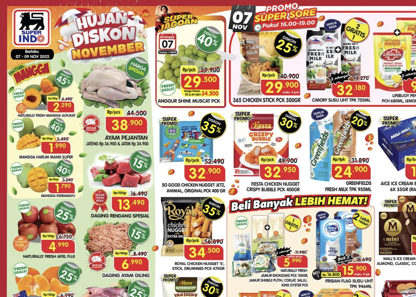 Pada awal pekan ini, 7-9 November 2025, di Superindo terdekat juga ada promo JSM Superindo yang menawarkan Diskon s/d 50% untuk berbagai produk. Berikut beberapa di antaranya:
