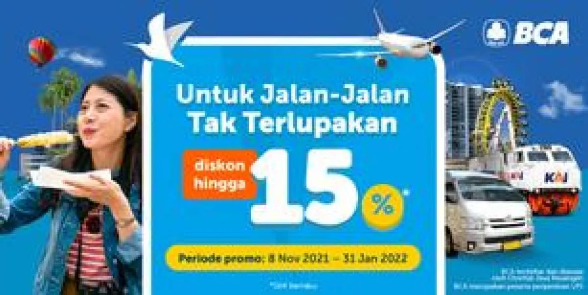 Segera nikmati diskon kartu kredit BCA hingga 15% untuk semua produk Traveloka, dari makan-makan, menginap, tempast wisata sampai bepergian. Periode pemesanan promo ini 8 November 2021 – 31 Januari 2022. Baca info lengkap promonya di bawah ini.