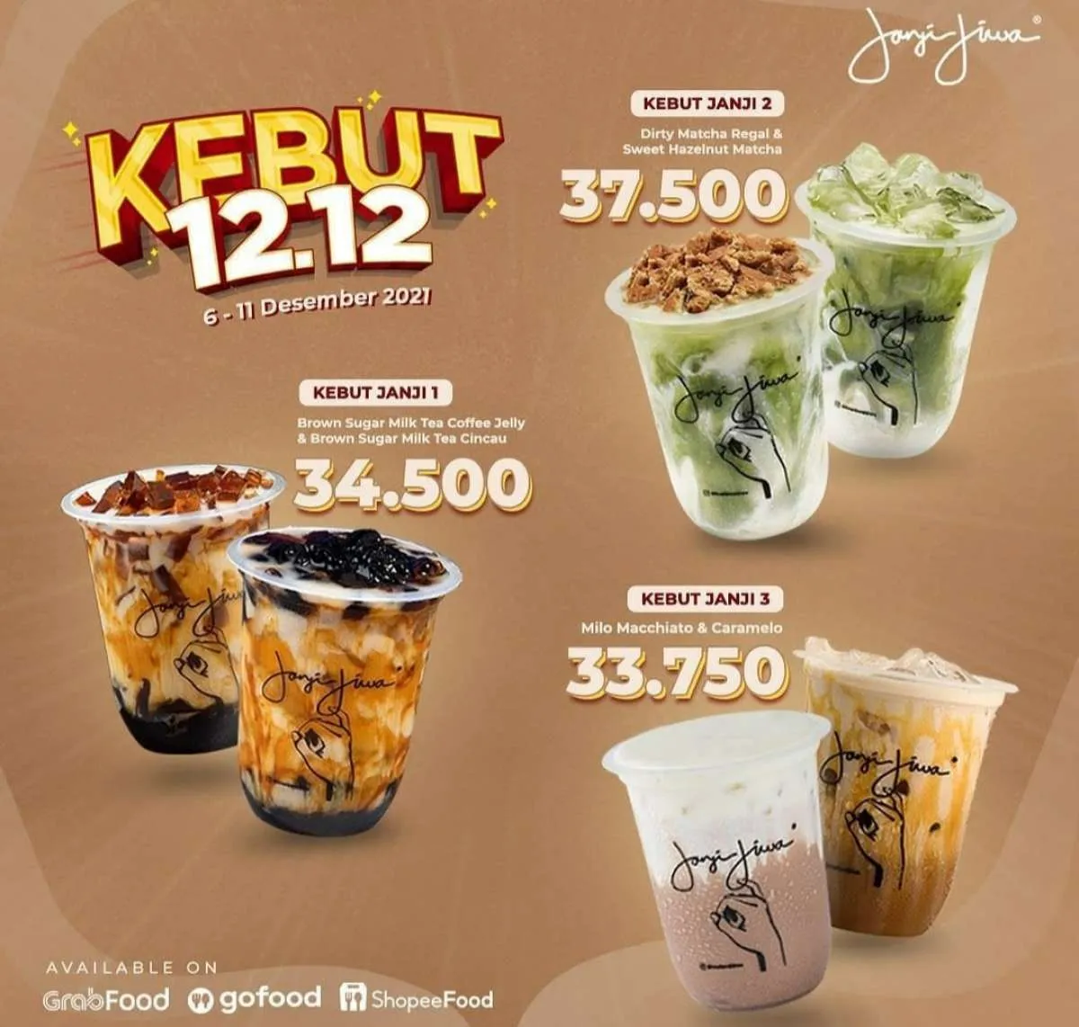 Sementara untuk paket promo Kebut 12.12 lainnya berupa minuman serba dobel, Janji Jiwa menghadirkan 3 paket pilihan, di antaranya: