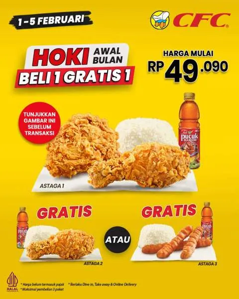 Selain itu, Anda juga bisa menikmati promo Hoki Awal Bulan dari CFC. Ada penawaran beli 1 gratis 1 untuk paket menu ayam goreng yang hemat banget lo.