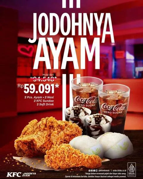 Melalui promo KFC Jodohnya Ayam, Anda bisa menikmati paket makan berdua yang komplit dengan menu berupa ayam goreng, nasi, sundae, dan soft drink. Semuanya bisa Anda dapatkan dengan harga terjangkau lo.