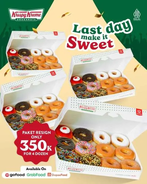 Dalam promo ini, Anda akan mendapatkan satu lusin Original Glazed dan satu lusin Basic Assorted. Paket hemat yang siap bikin hari-hari Anda makin manis di tengah menjalankan aktivitas.