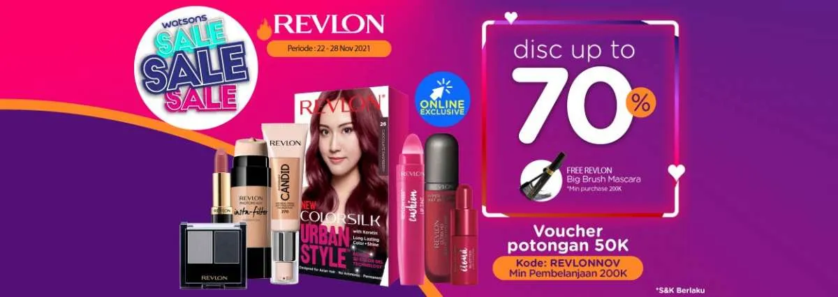 Berlaku hingga tanggal 28 November 2021, promo Watsons kali ini menawarkan Diskon s/d 70% untuk berbagai produk makeup dan hair color dari merek Revlon.