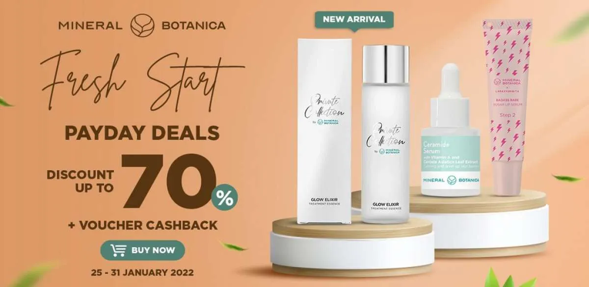 Kebetulan, di Shopee Mineral Botanica Official Shop sedang ada promo Fresh Start Payday Deals. Berlaku 25-31 Januari 2022, promo ini menawarkan Diskon sampai dengan (s/d) 70% + Voucher Cashback.