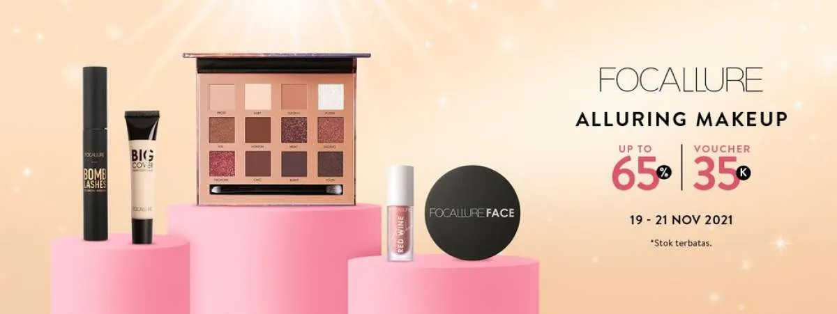 Bagi Moms para pecinta produk Focallure atau yang masih penasaran dengan brand satu ini, ada promo Focallure Alluring Makeup yang bisa dimanfaatkan untuk belanja makeup Focallure dengan harga jauh lebih murah lagi. Adapun penawaran menarik dalam promo ini yaitu Diskon up to 65%.