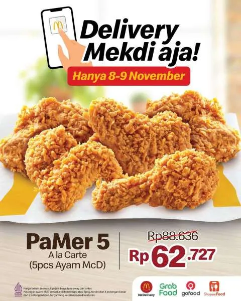 Untuk menikmati promo ini, Anda bisa langsung pesan di McDelivery, GrabFood, GoFood, dan ShopeeFood di tanggal 8-9 November 2025 saja. Jadi, pastikan Anda tidak melewatkan kesempatan ini.