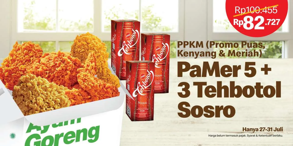 Dengan promo ini, anda bisa mendapatkan Paket PaMer 5 yang berisi 5 potong ayam goreng & 3 buah Tehbotol Sosro. Dari 5 potong ayam goreng ini, anda bisa bebas pilih varian rasa baik yang spicy, original/krispi, ataupun yang mix.