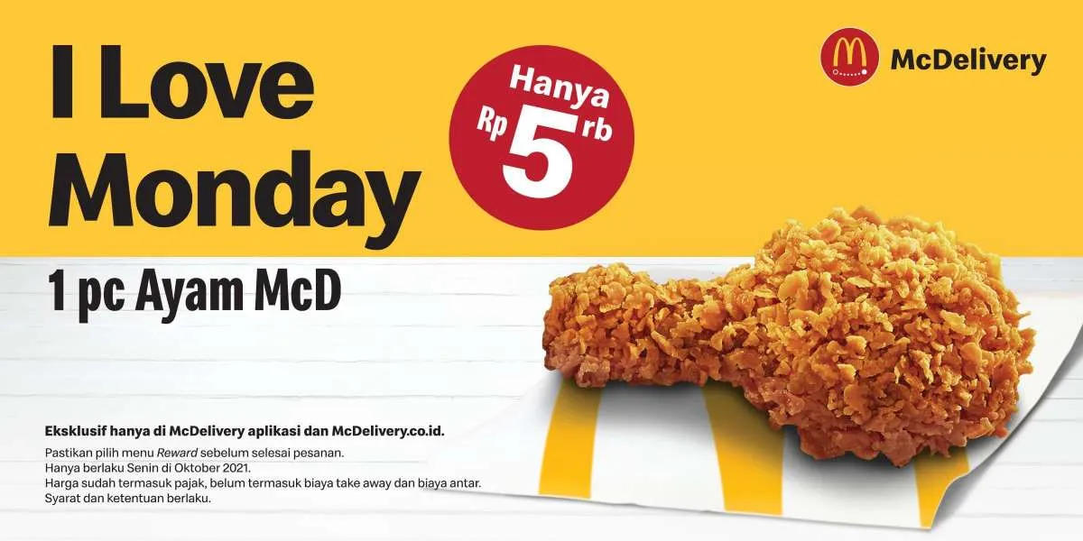 Promo I Love Monday 1 ayam McD Rp 5.000 ini berlaku setiap hari Senin selama bulan Oktober 2021. Jadi, pastikan agar anda tidak ketinggalan promo diskon kulineran murah ala McDonald ini.