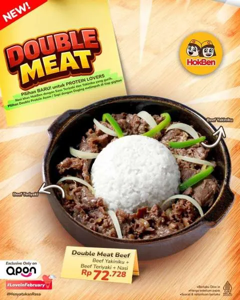 - Double Meat Beef (Rp 72.728): Beef Yakiniku + Beef Teriyaki + Nasi