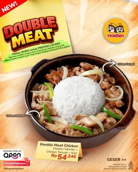 - Double Meat Chicken (Rp 54.546): Chicken Yakiniku + Chicken Teriyaki + Nasi
