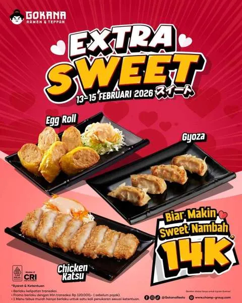 Selain itu, untuk menyambut Valentine, Gokana hadirkan promo Extra Sweet yang super murah. Anda bisa menikmati beragam side dish favorit hanya dengan Rp 14.000 saja lo.