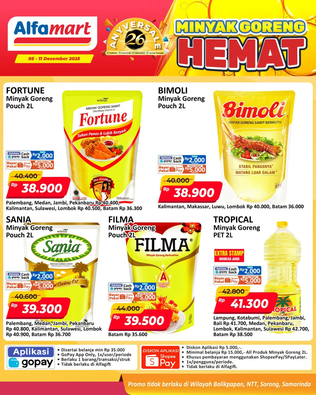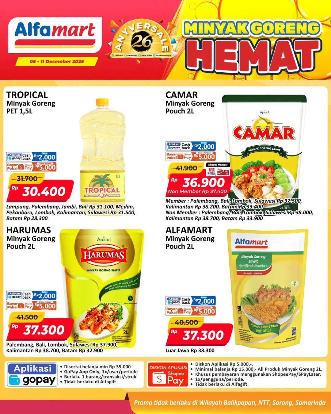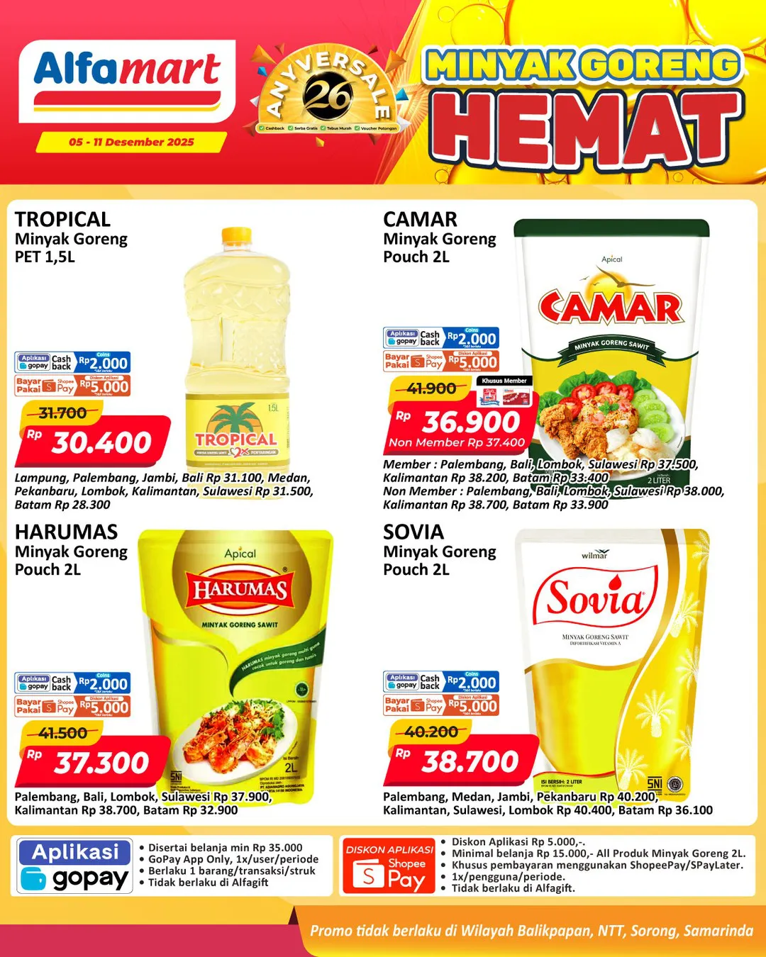 Oh iya, promo minyak goreng Alfamart periode 5-11 Desember 2025 berlaku di Alfamart seluruh Indonesia kecuali Alfamart di wilayah Nusa Tenggara Timur (NTT), Balikpapan, Samarinda, dan Sorong ya Moms.
