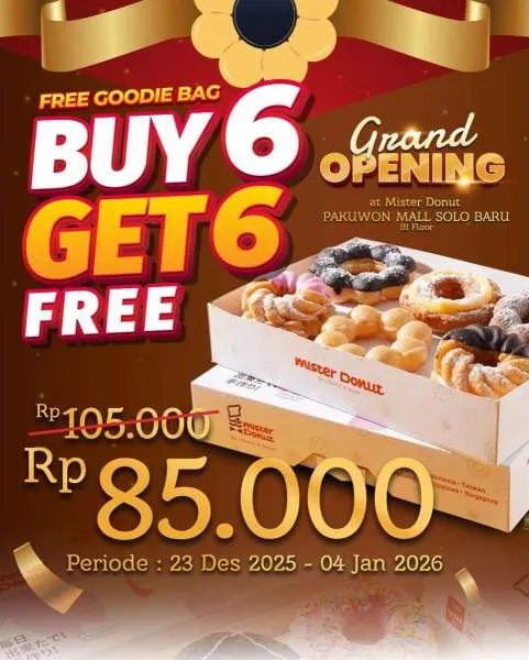 Selain itu, dalam rangka Grand Opening Mister Donut Pakuwon Mall Solo Baru, ada promo Buy 6 Get 6 Free.