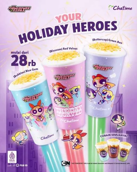 Selain itu, jangan lupa kalau Chatime hadir dengan tema The Powerpuff Girls Edition yang seru banget. Bertajuk Your Holiday Heroes, Anda bisa menikmati minuman-minuman spesial bercita rasa unik mulai Rp 28.000 saja.