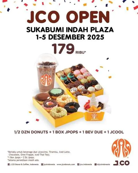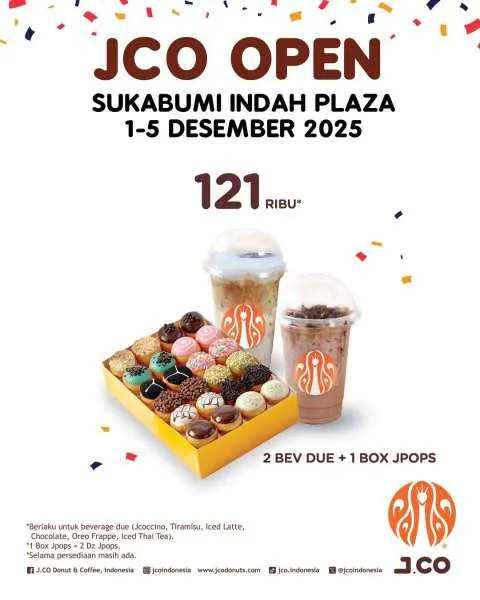Buat Anda yang ada di sekitar Sukabumi, Medan, dan Baturaja, inilah saat yang ditunggu-tunggu pun tiba. Kini Anda bisa menikmati kelezatan Donut J.CO dengan harga lebih hemat pakai promo Grand Opening Deals.