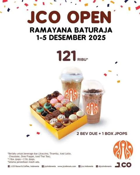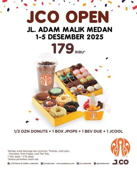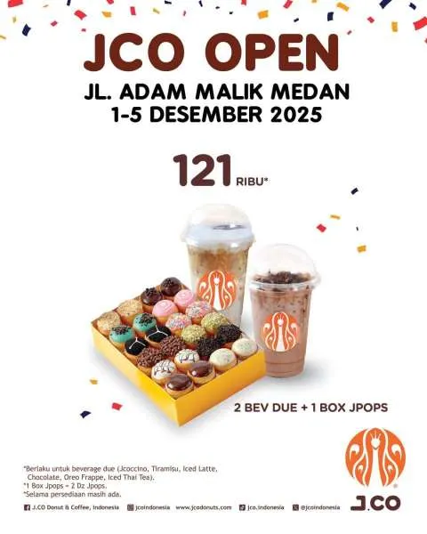 MOMSMONEY.ID - Grand Opening J.CO di tiga lokasi hadirkan promo spesial yang sayang untuk Anda lewatkan. Ada paket hemat Donut dan Beverage yang terbatas banget mulai tanggal 1-5 Desember 2025 saja.