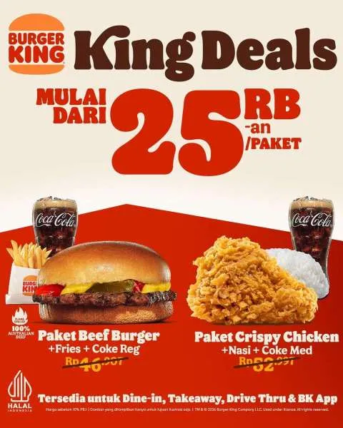 Dikutip dari Instagram @burgerking.id, mulai dari Rp 25.000-an per paket, Anda sudah mendapatkan paket spesial berikut: