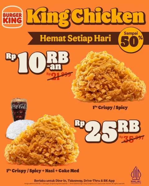 Selain itu, Burger King juga punya promo King Chicken. Inilah waktunya untuk menikmati ayam goreng favorit khas Burger King mulai Rp 10.000-an saja.