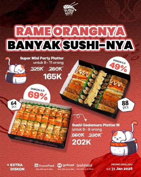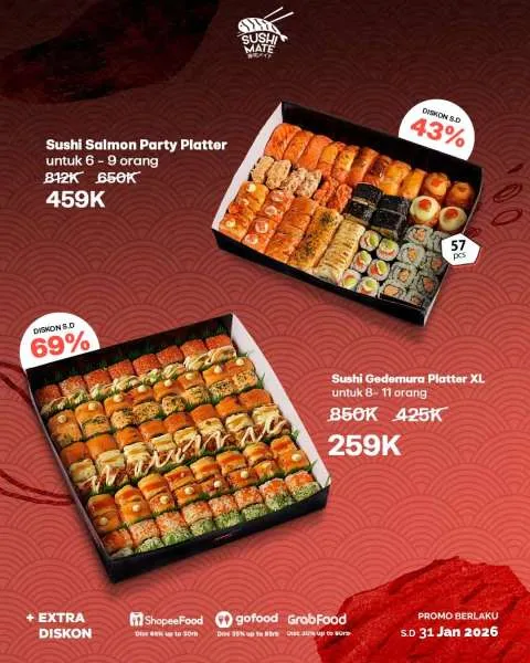 Dikutip dari Instagram @sushimate.id, promo Sushi Platter menyediakan empat pilihan paket hemat yang bisa Anda nikmati berikut: