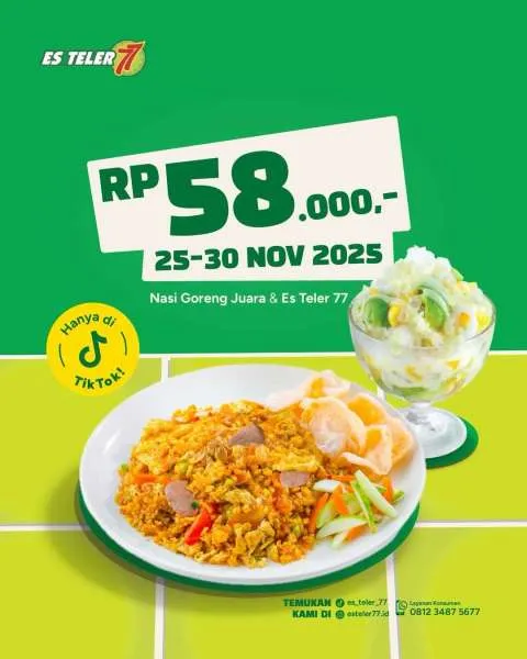 Dikutip dari Instagram Es Teler 77 Indonesia, hanya dengan Rp 58.000, Anda sudah mendapatkan Nasi Goreng Juara dan Es Teler 77. Kombinasi menu yang nggak cuma enak, tapi juga bikin puas dan harga yang worth it banget.