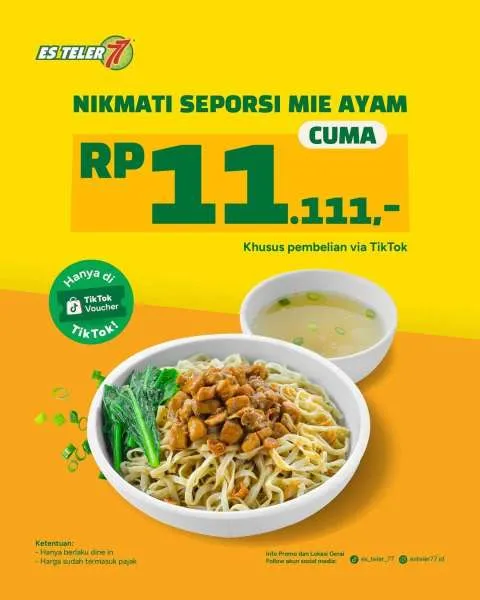 Selain itu, Es Teler 77 juga ada promo spesial lainnya melalui TikTok. Anda bisa menikmati Mie Ayam lezat hanya dengan Rp 11.000-an saja lo.