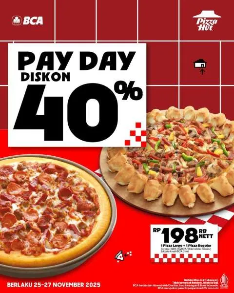 Selain itu, Pizza Hut juga ada promo Payday lainnya khusus untuk pengguna BCA. Anda bisa dapat dua Pizza favorit dengan harga spesial sampai 27 November 2025 saja.