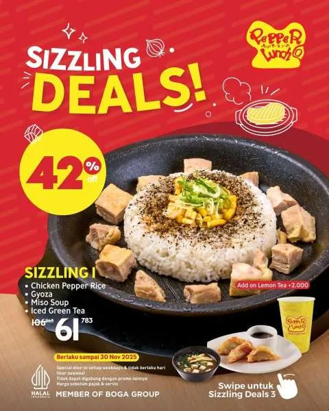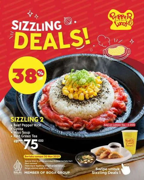 Yuk, serbu promonya di Pepper Lunch terdekat dan nikmati paket Sizzling Deals favorit Anda sebelum kehabisan!