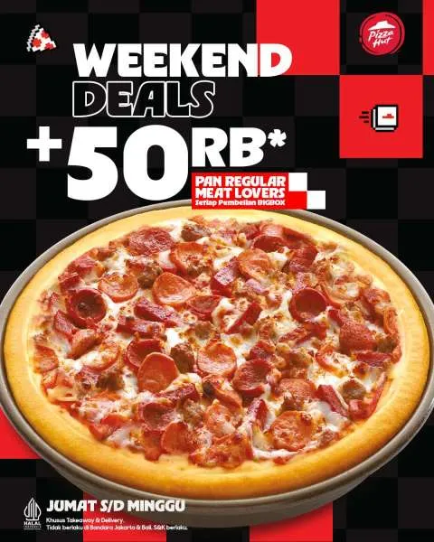 MOMSMONEY.ID - Yuk, bikin akhir pekan Anda makin seru dan nikmat dengan promo Pizza Hut Weekend Deals. Di sinilah Anda bisa menikmati satu pan Regular Meat Lovers cuma Rp 50.000, lo.