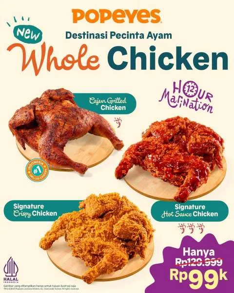 Dikutip dari Instagram Popeyes Indonesia, hanya dengan Rp 99.000, Anda sudah mendapatkan Whole Chicken spesial, yang harga normalnya Rp 129.000-an. Tersdia tiga pilihan varian berikut: