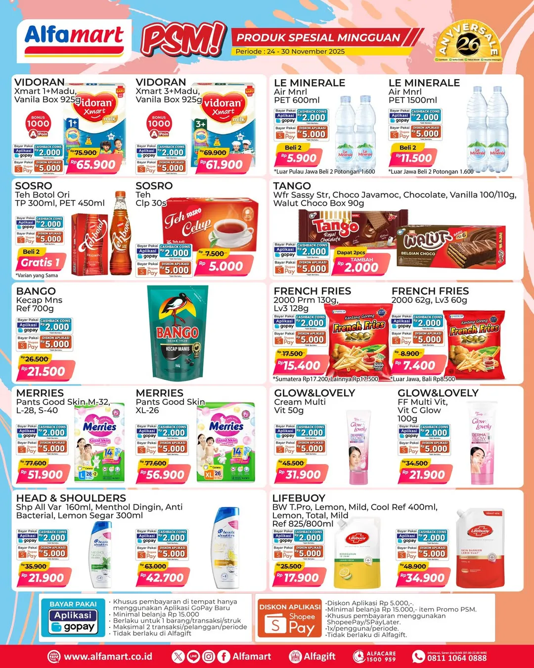 Selama 24-30 November 2025, ada promo PSM (Produk Spesial Mingguan) dari Alfamart yang menawarkan berbagai produk dengan harga jauh lebih ekonomis.