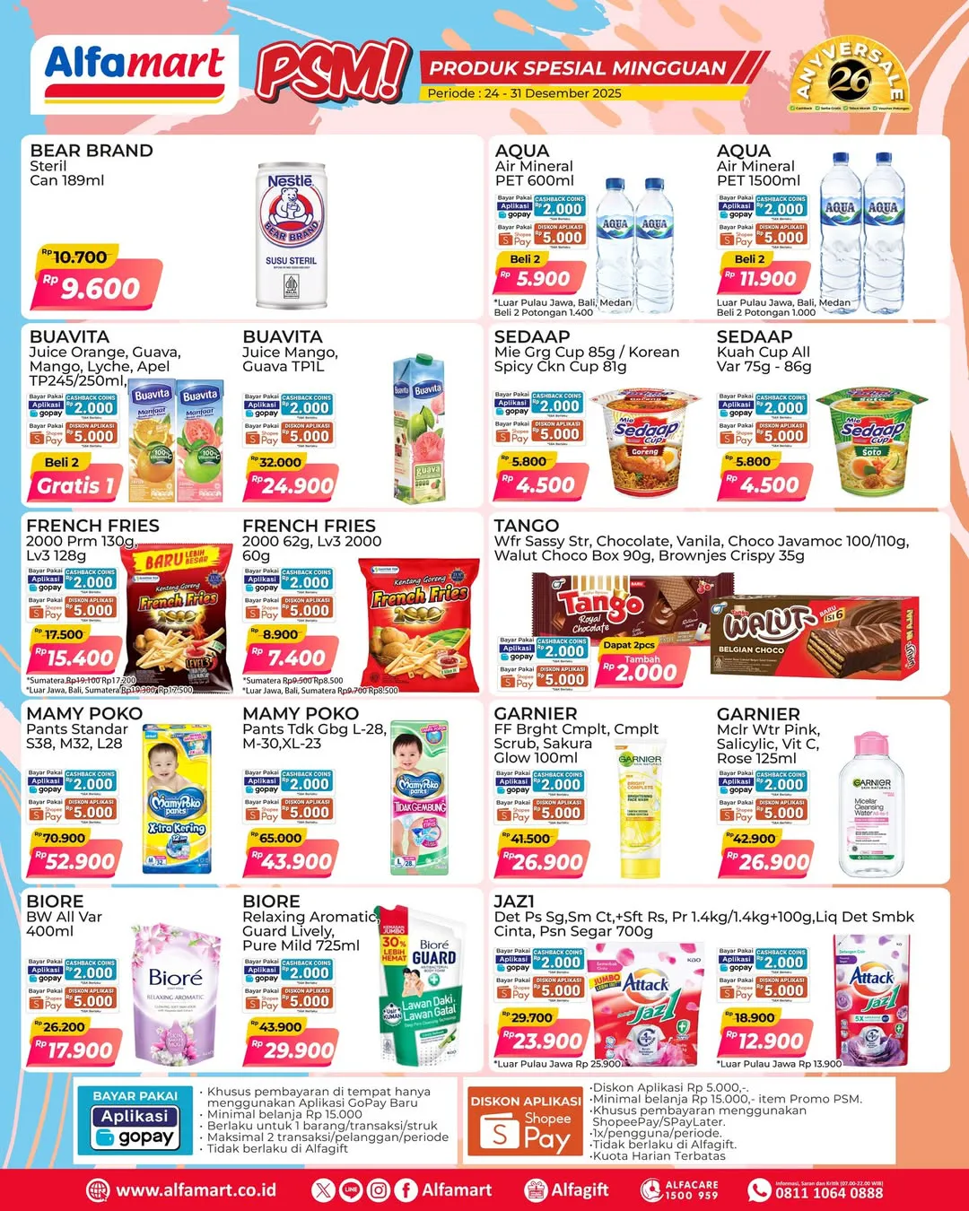 Selama 24-31 Desember 2025, ada promo PSM (Produk Spesial Mingguan) dari Alfamart yang menawarkan berbagai produk dengan harga lebih ekonomis.