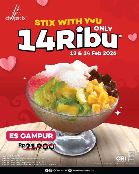 Selain itu, untuk menyambut Valentine, ada juga promo Stix With You dari Chopstix. Anda bisa menikmati es campur segar dengan lebih hemat selama dua hari saja.