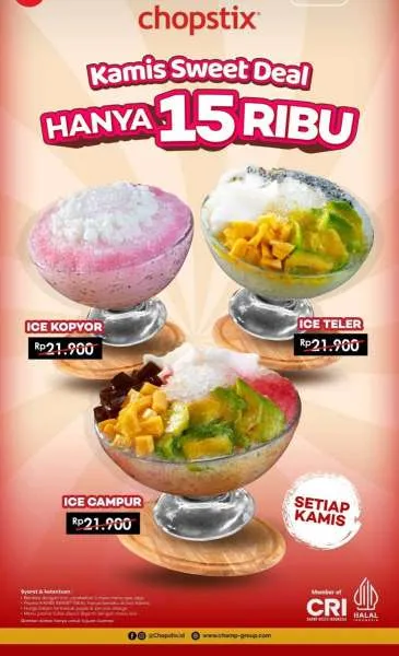 Khusus hari Kamis, Chopstix menghadirkan promo spesial aneka es favorit yang siap menyegarkan Anda. Mulai dari es kopyor, es teler, hingga es campur dengan topping yang nikmat.