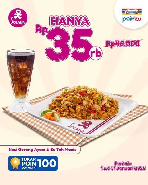 Selain itu, jangan ketinggalan juga dengan promo Solaria dengan aplikasi Indomaret Poinku. Karena Anda berkesempatan menikmati Nasi Goreng Ayam dan Es Teh hanya Rp 35.000 saja.