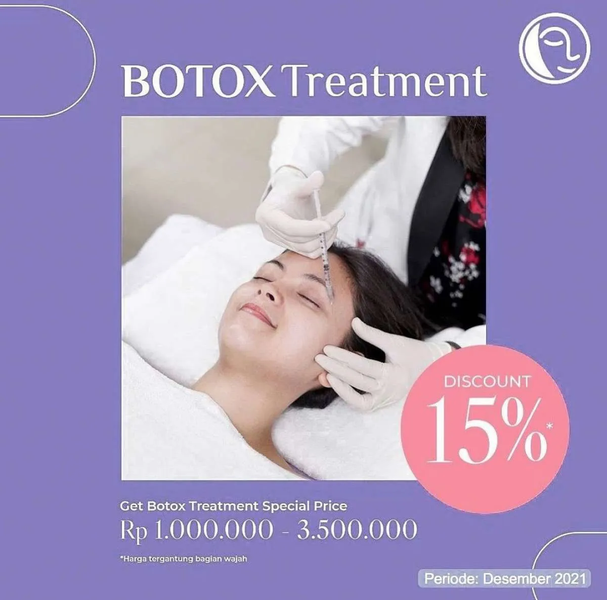 Dalam promo Botox Treatment Periode Desember 2021, ada Diskon 15% untuk perawatan Botox dengan Harga Spesial yakni Rp 1.000.000 – Rp 3.500.000 (tergantung bagian wajah) yang dapat Anda nikmati.