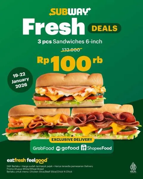 Selain itu, hari ini adalah kesempatan terakhir menikmati promo Fresh Deals di Subway. Anda bisa dapat tiga Sandwich sekaligus dengan harga Rp 100.000 saja melalui GoFood, GrabFood, dan ShopeeFood.
