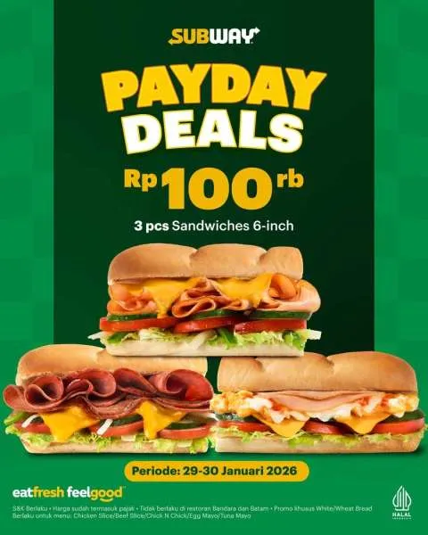 Selain itu, Anda juga masih bisa menikmati promo Payday delivery di Subway sampai 31 Januari 2026. Ada penawaran Buy 1 Get 1 dengan menu spesialnya yang siap memanjakan lidah Anda.