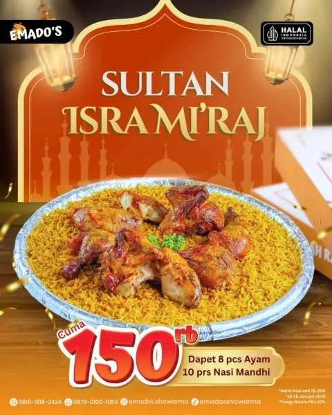 MOMSMONEY.ID - Menyambut libur Isra Miraj, Emado’s menghadirkan promo Sultan Isra Miraj yang pas untuk menemani momen kebersamaan dengan keluarga. Anda bisa mendapatkan 8 ayam dan 10 porsi nasi mandhi dengan harga spesial.