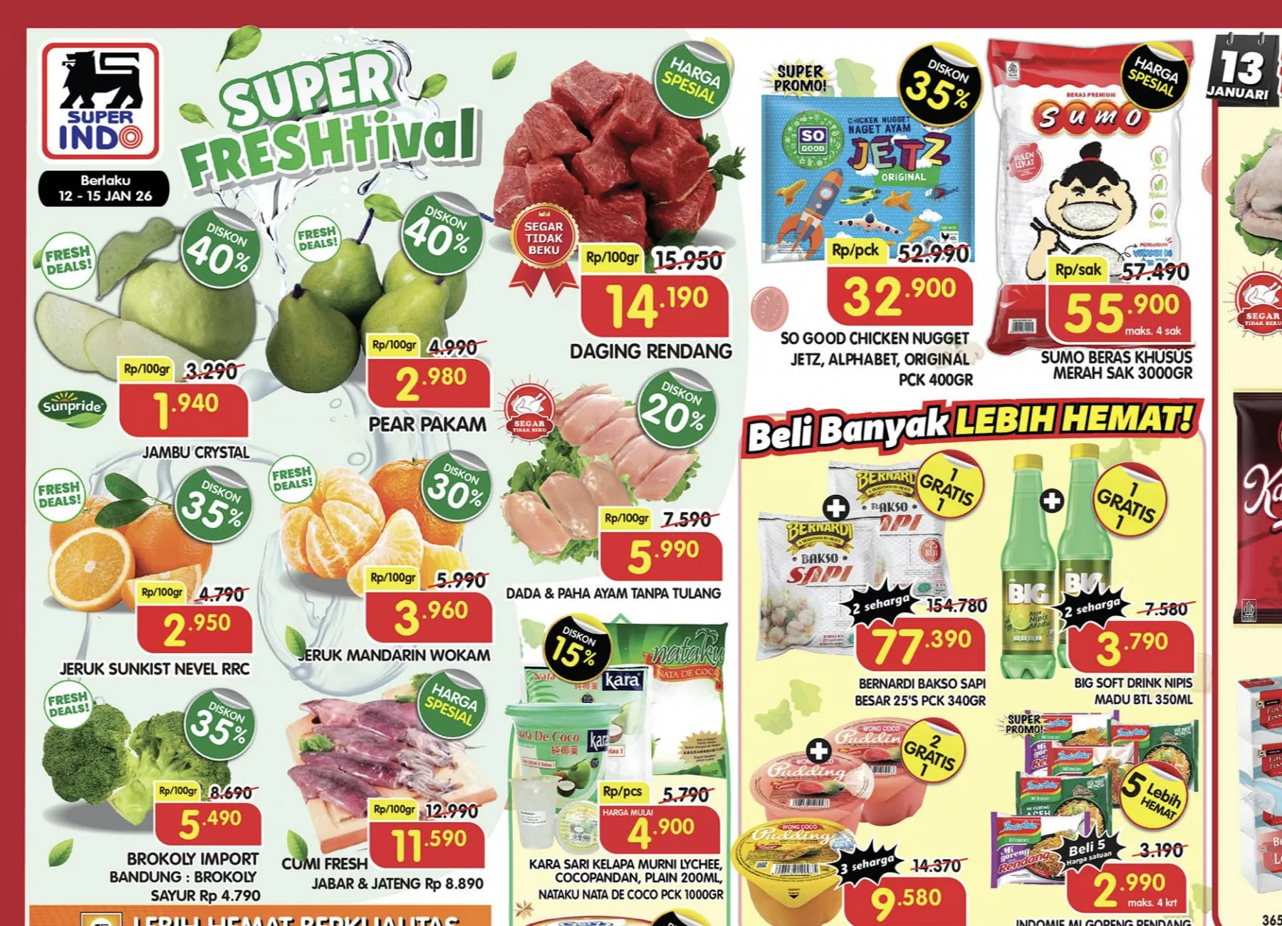 Pada awal pekan ini, 12-15 Januari 2026, di Superindo terdekat juga ada promo Superindo Weekday yang menawarkan Diskon sampai 40% untuk berbagai produk. Berikut beberapa di antaranya: