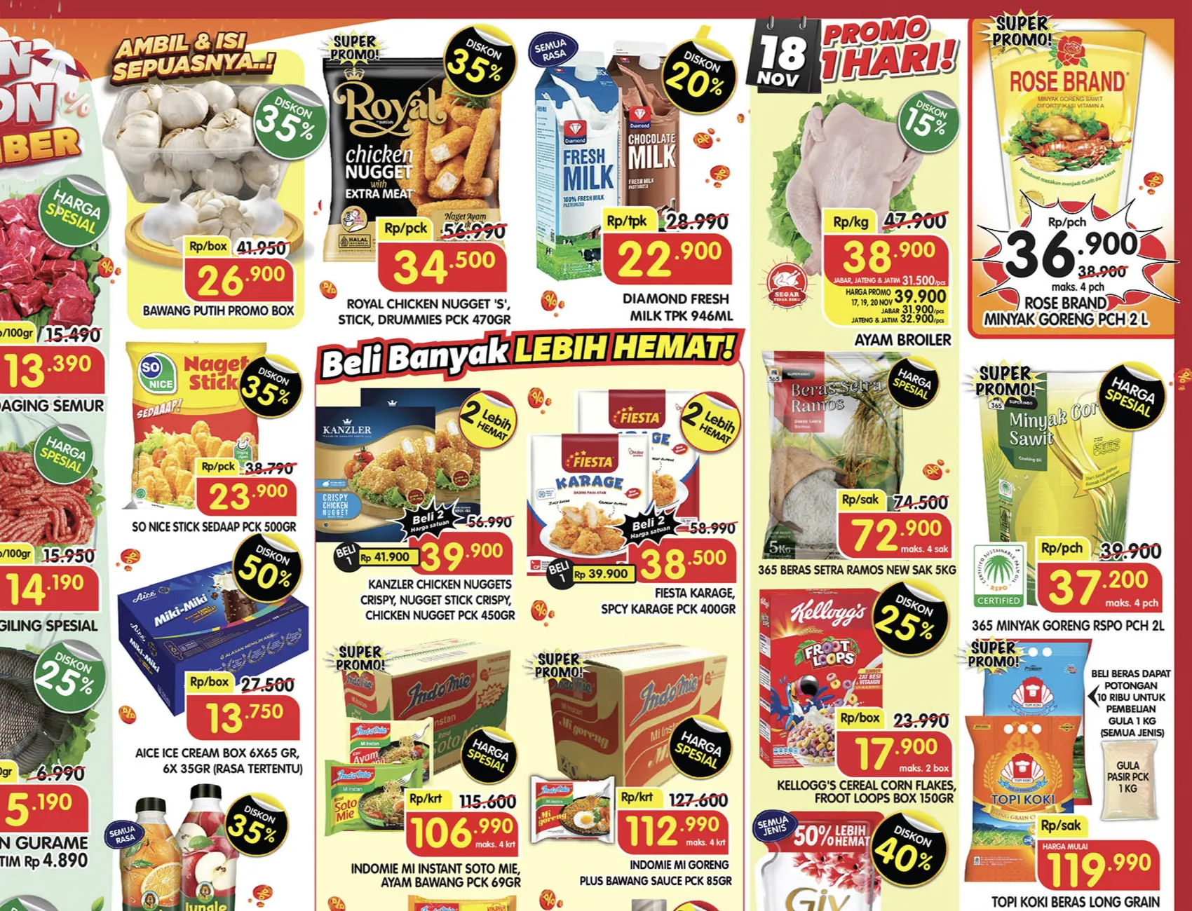 Promo 1 Hari (18 November 2025) di promo Superindo Weekday untuk Ayam Broiler, 365 Beras Setra Ramos, Kellogg’s Cereal, dan GIV Body Wash. /2025/11/17/1932487417o.jpg)
