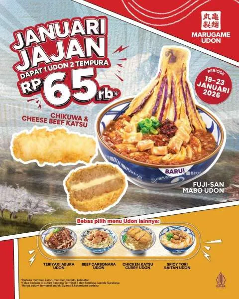 MOMSMONEY.ID - Jangan sampai melewatkan kesempatan terakhir untuk jajan hemat di Marugame Udon dengan promo spesialnya ya! Ada promo Januari Jajan untuk menikmati paket Fuji-San Mabo Udon dan tempura dengan lebih irit.